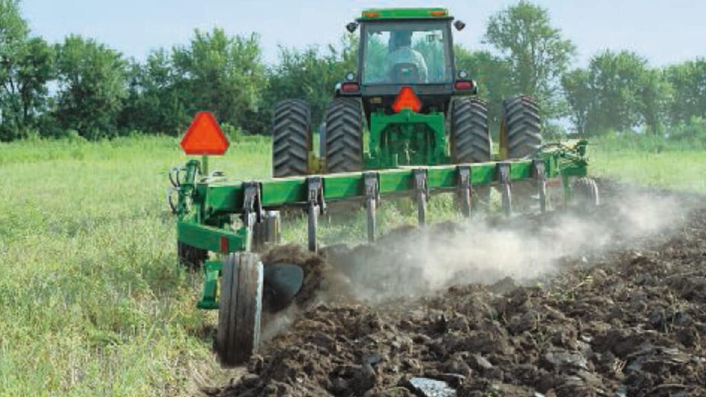 The operator can change the plow’s width of cut to match the tractor horsepower and soil conditions.